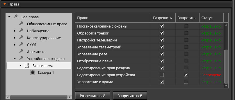 Администратор системы может настраивать разрешения на воспроизведение, запись и трансляцию конкретной камеры (параметр находится в свойствах камеры), а так же менять политики доступа к функциям проигрывателя для каждого пользователя (параметр находится в конфигурации в разделе доступ).