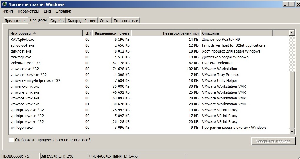 VideoNet 32-битное приложение, один процесс, сюда входит всё ( проигрыватель, платы захвата, IP устройства и т.п.). Естественно память не безгранична и при её достижении 2 гб система может остановиться. Тут мы или расширяем границу выделенной памяти до 3 гб, или ставим 64-битную ОС, получаем 3,5 гб.