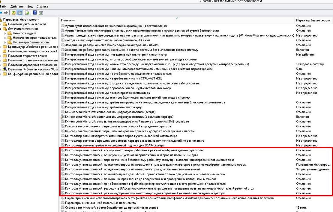 запустил оснастку secpol.msc и в ветке "Локальные политики" - "Параметры безопасности" вручную деактивировал политики безопасности, связанные с контролем учетных записей