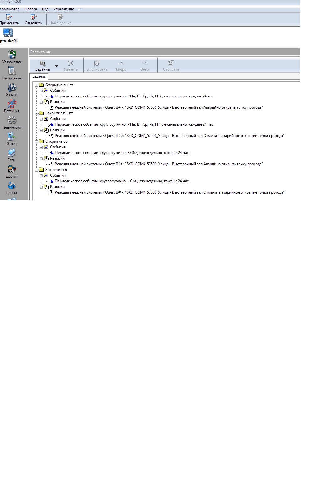 Добрый день. Построена СКД на quest. Для автооткрытия двери используется VideoNet. дверь открывается по расписанию настроенному в VideoNet. Но происходит какая то ерунда. Система самопроизвольно открывает дверь в не назначенное расписание. Расписание такое. дверь открывает по пн.вт.ср.чт.пт. в 9:00 через каждые 24 часа и закрывается по тем же дням в 18:00 каждые 24 часа и открывается в сб. 9:00 каждые 24 часа и закрывает в сб. 14:00 каждые 24 часа см. рис1