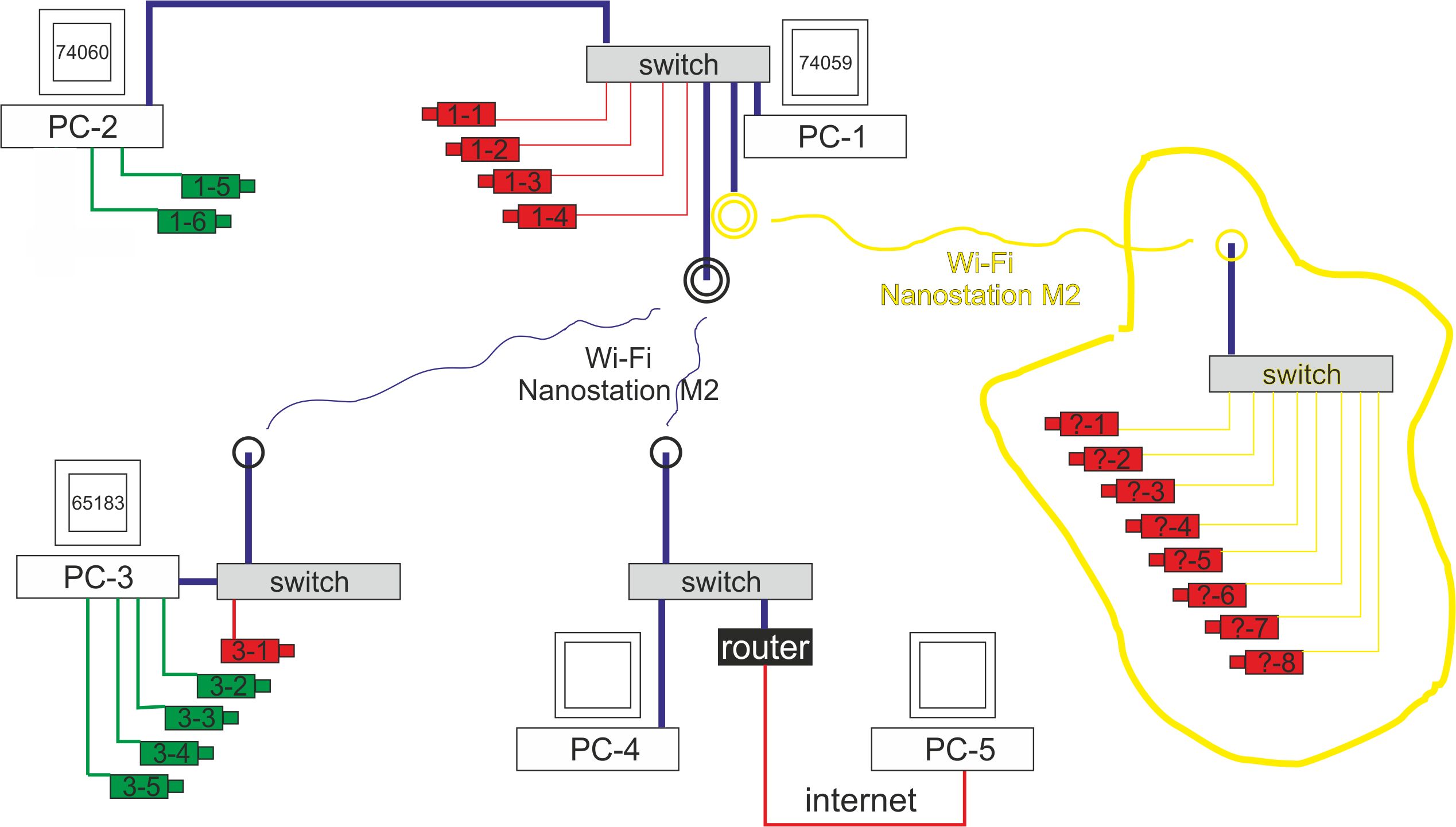 1. Вариант первый: как нарисован на рисунке. Хватит ли пропускной способности wifi для передачи информации с восьми камер и какие должны быть технические требования к компьютеру № 1 что бы он смог писать видео с 14 камер. Камеры 1-5, 1-6 пишутся на PC-1.