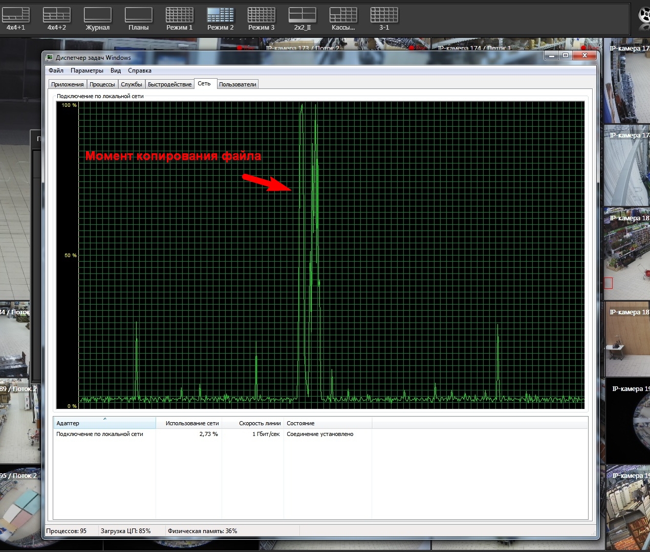 Cервер принимает 29 ip-камер RVI, разрешение которых oграничено до FullHD 1920х1080, битрейт понижен до минимально приемлего 2000 мбит/сек, трансляция на сервер идет 10 к/с. Сервер работает под ОС Windows Server 2012.